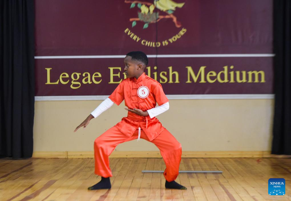A student performs during a Chinese talent show at the Legae English Medium School in Gaborone, the capital of Botswana, July 28, 2025. A Chinese talent show was held here on Monday to provide students with a platform to explore Chinese culture and deepen cross-cultural understanding through diverse performances. (Photo by Tshekiso Tebalo/Xinhua)