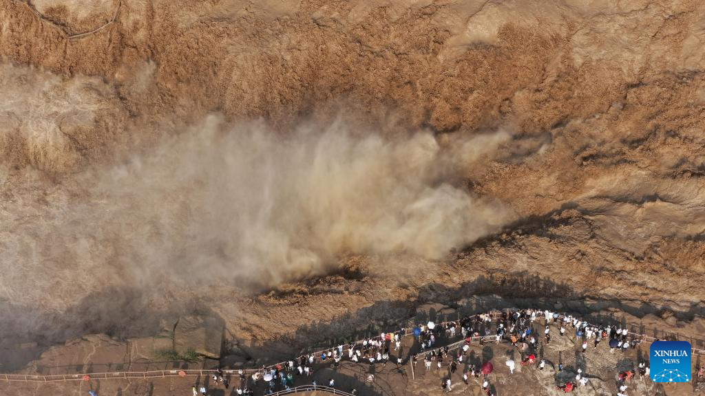 An aerial drone photo taken on July 27, 2025 shows people visiting the Hukou Waterfall on the Yellow River in Jixian County, north China's Shanxi Province.