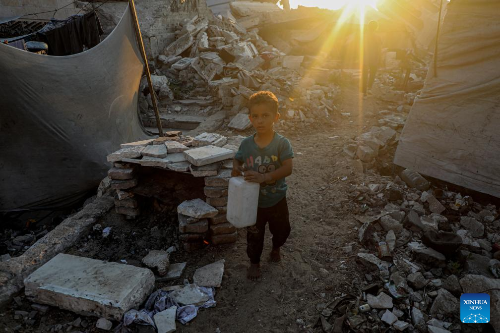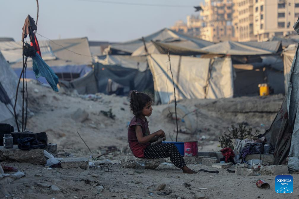A displaced Palestinian child is seen at a shelter in the west of Gaza City on July 26, 2025. (Photo by Rizek Abdeljawad/Xinhua)