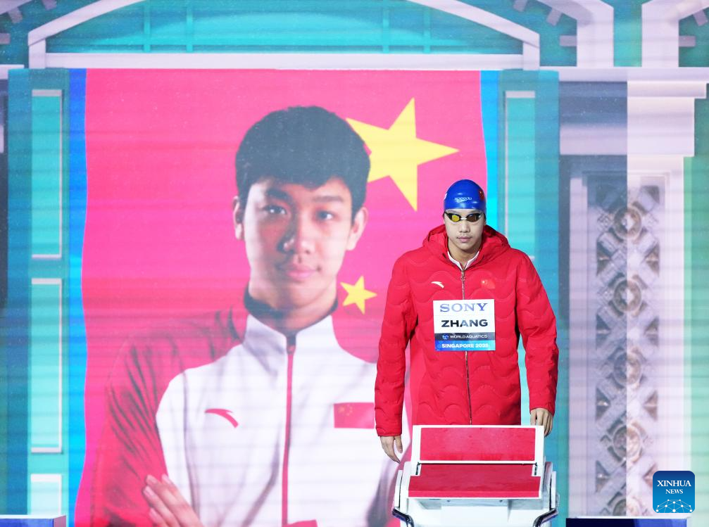 Zhang Zhanshuo of China reacts before the men's 400m freestyle of swimming at the World Aquatics Championships in Singapore, July 27, 2025. (Xinhua/Luo Yuan)