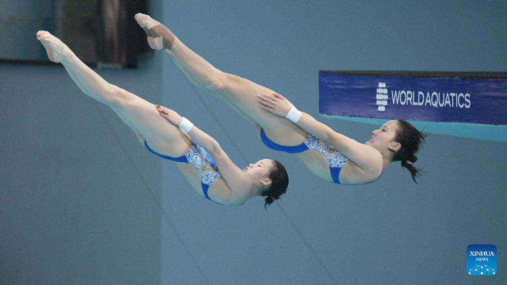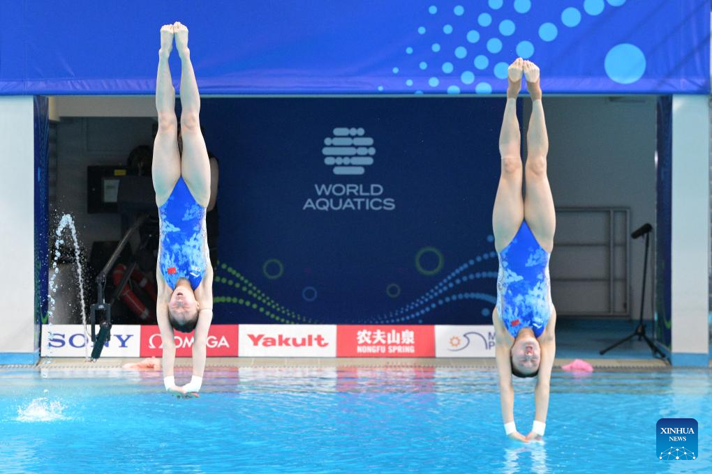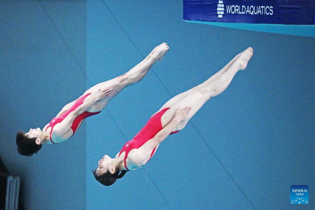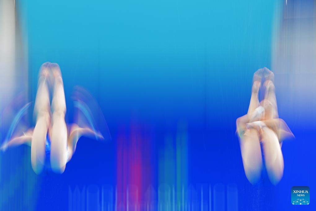Chen Yuxi/Zhang Minjie of China compete during the women's 10m synchronised final of diving at the World Aquatics Championships in Singapore, July 28, 2025. (Xinhua/Luo Yuan)
