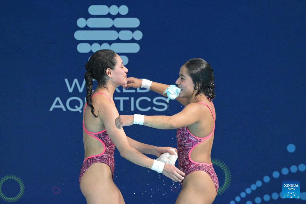 Gabriela Agendez Garcia/Alejandra Estudillo Torres of Mexico hug each other after the women's 10m synchronised final of diving at the World Aquatics Championships in Singapore, July 28, 2025. (Photo by Then Chih Wey/Xinhua)