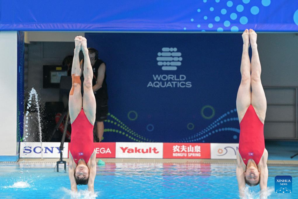 Jo Jin Mi/Kim Mi Hwa of the Democratic People's Republic of Korea (DPRK) compete during the women's 10m synchronised final of diving at the World Aquatics Championships in Singapore, July 28, 2025. (Photo by Then Chih Wey/Xinhua)