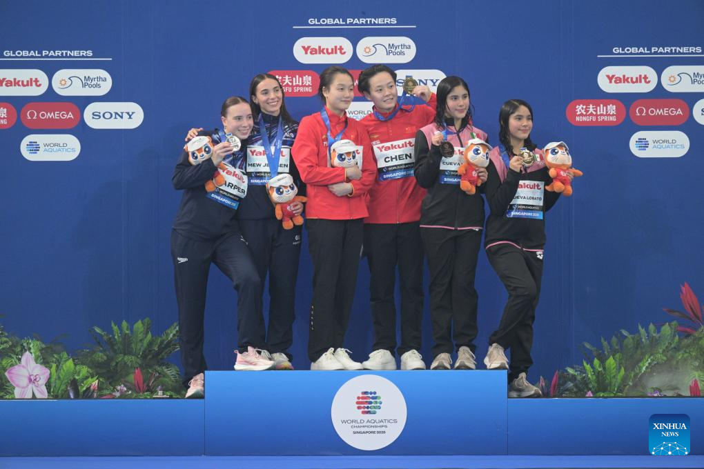 Gold medalists Chen Jia (3rd L)/Chen Yiwen (3rd R) of China, silver medalists Yasmin Harper (1st L)/Scarlett Mew Jensen (2nd L) of Britain and bronze medalists Lia Yatzil Cueva Lobato/Mia Zazil Cueva Lobato of Mexico pose during the awarding ceremony for the women's 3m synchronised springboard final of diving at the World Aquatics Championships in Singapore, July 29, 2025. (Photo by Then Chih Wey/Xinhua)