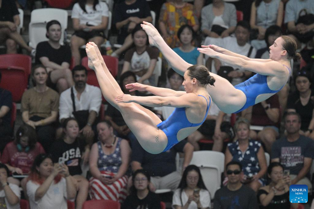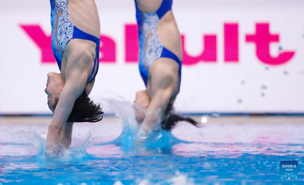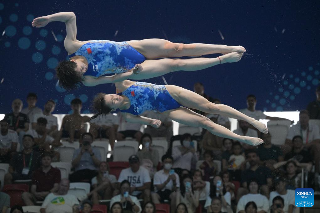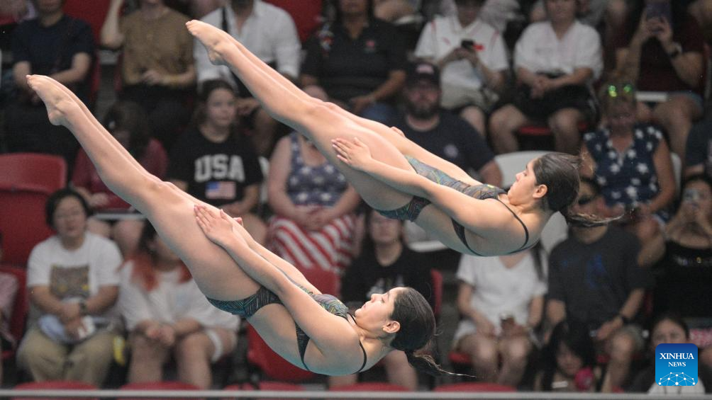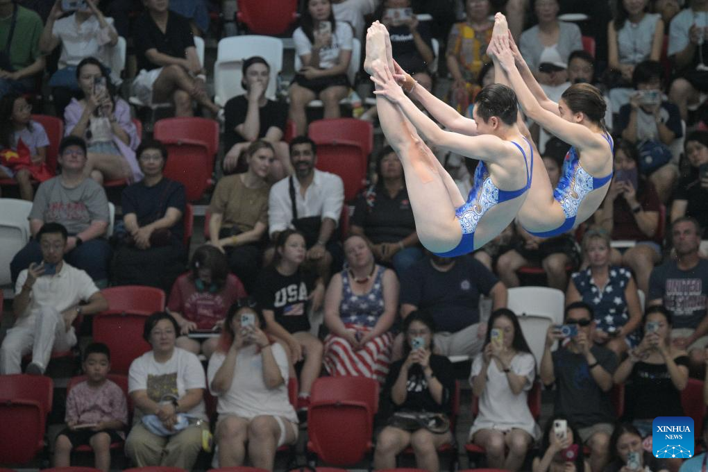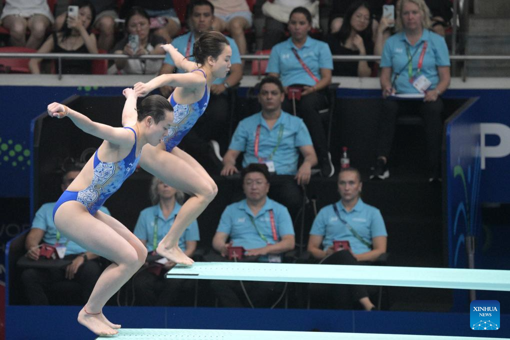 Chen Jia/Chen Yiwen (L) of China compete during the women's 3m synchronised springboard final of diving at the World Aquatics Championships in Singapore, July 29, 2025. (Xinhua/Wu Zhizun)