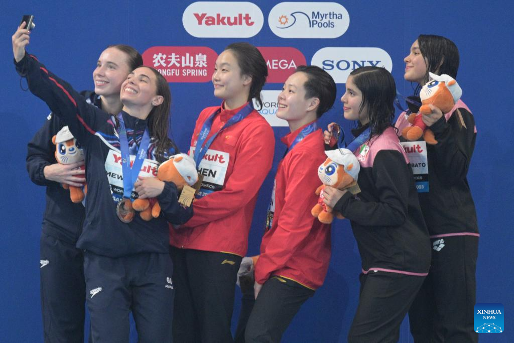 Gold medalists Chen Jia (3rd L)/Chen Yiwen (3rd R) of China, silver medalists Yasmin Harper (1st L)/Scarlett Mew Jensen (2nd L) of Britain and bronze medalists Lia Yatzil Cueva Lobato/Mia Zazil Cueva Lobato of Mexico take photos after the awarding ceremony for the women's 3m synchronised springboard final of diving at the World Aquatics Championships in Singapore, July 29, 2025. (Photo by Then Chih Wey/Xinhua)