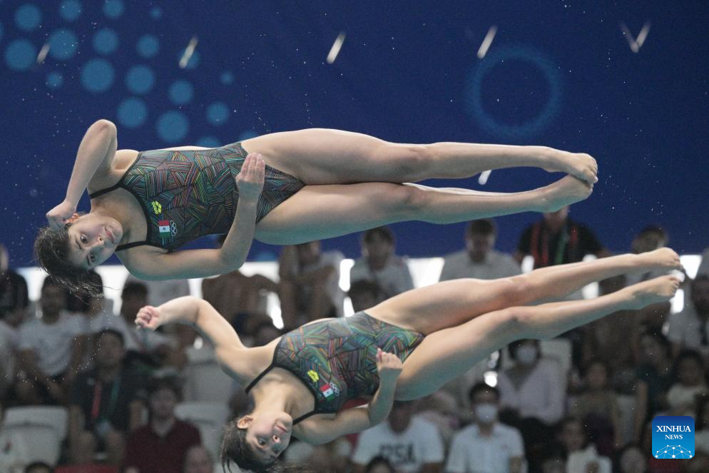 Lia Yatzil Cueva Lobato/Mia Zazil Cueva Lobato of Mexico compete during the women's 3m synchronised springboard final of diving at the World Aquatics Championships in Singapore, July 29, 2025. (Photo by Then Chih Wey/Xinhua)