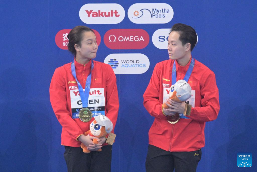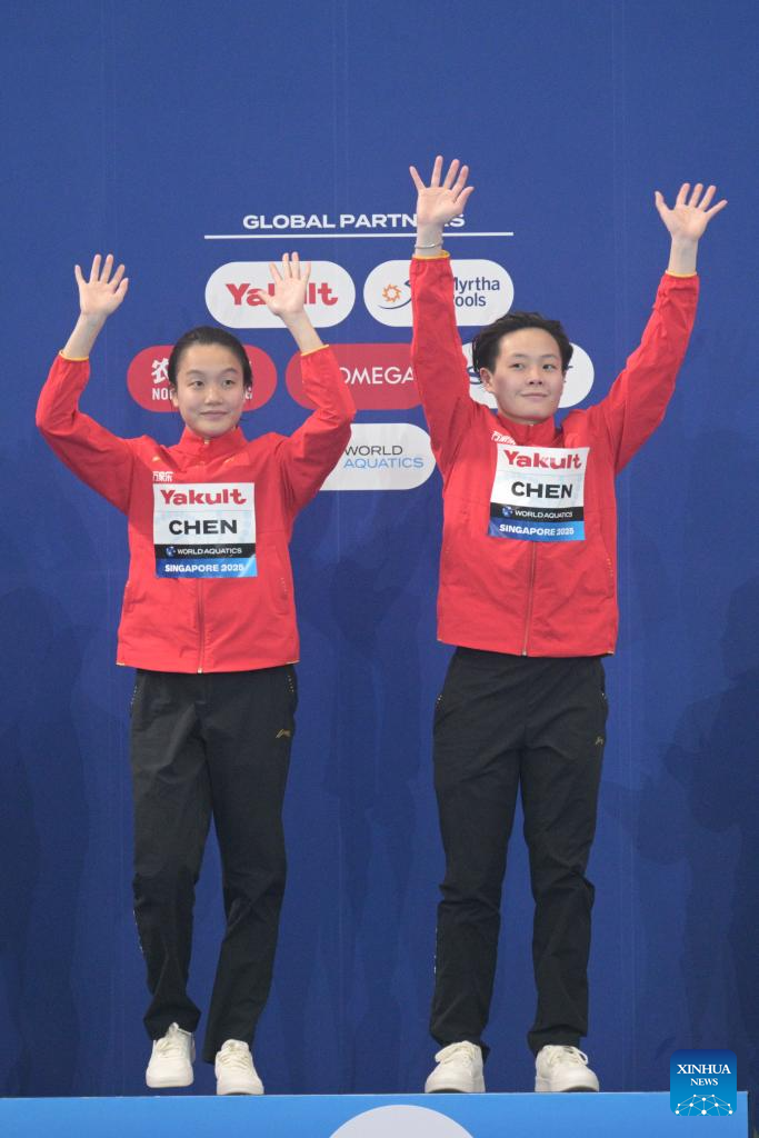 Chen Jia (L)/Chen Yiwen of China attend the awarding ceremony for the women's 3m synchronised springboard final of diving at the World Aquatics Championships in Singapore, July 29, 2025. (Xinhua/Wu Zhizun)