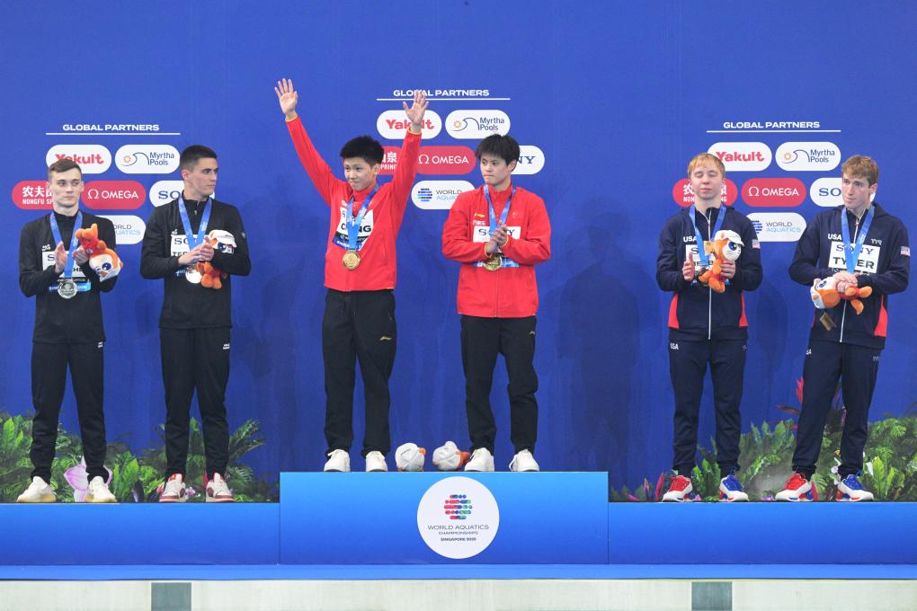 Gold medalists Cheng Zilong (3rd L)/Zhu Zifeng (3rd R) of China pose during the awarding ceremony for the men's synchronised 10m platform final of diving at the World Aquatics Championships in Singapore, July 29, 2025. (Photo by Then Chih Wey/Xinhua)