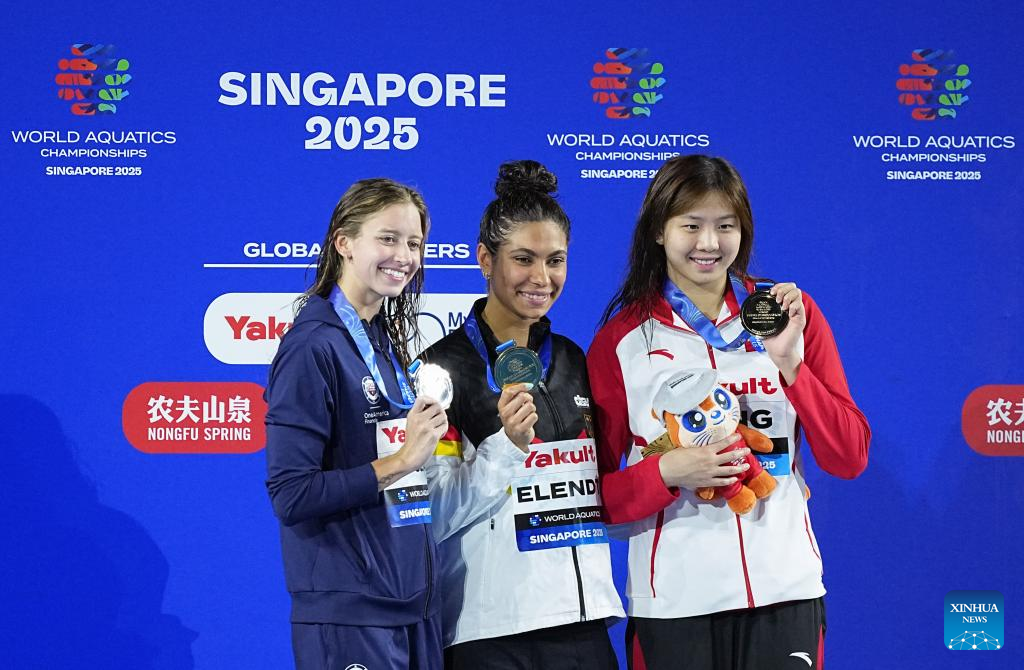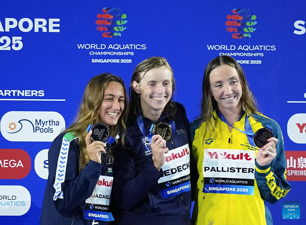 Gold medalist Katie Ledecky (C) of the United States, silver medalist Simona Quadarella (L) of Italy and bronze medalist Lani Pallister of Australia pose during the awarding ceremony for the women's 1500m freestyle final of swimming at the World Aquatics Championships in Singapore, July 29, 2025. (Xinhua/Xue Yuge)