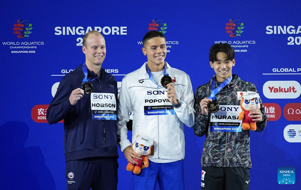 Gold medalist David Popovici (C) of Romania, silver medalist Luke Hobson (L) of the United States and bronze medalist Murasa Tatsuya of Japan pose during the awarding ceremony for the men's 200m freestyle final of swimming at the World Aquatics Championships in Singapore, July 29, 2025. (Xinhua/Xue Yuge)