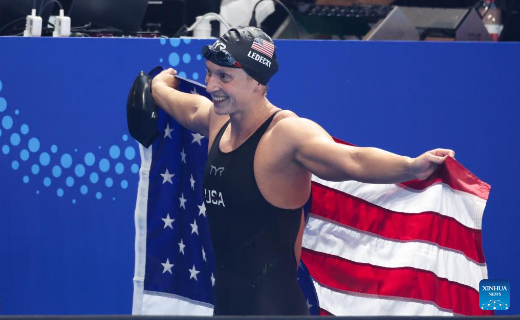 Katie Ledecky of the United States celebrates after the women's 1500m freestyle final of swimming at the World Aquatics Championships in Singapore, July 29, 2025. (Xinhua/Luo Yuan)