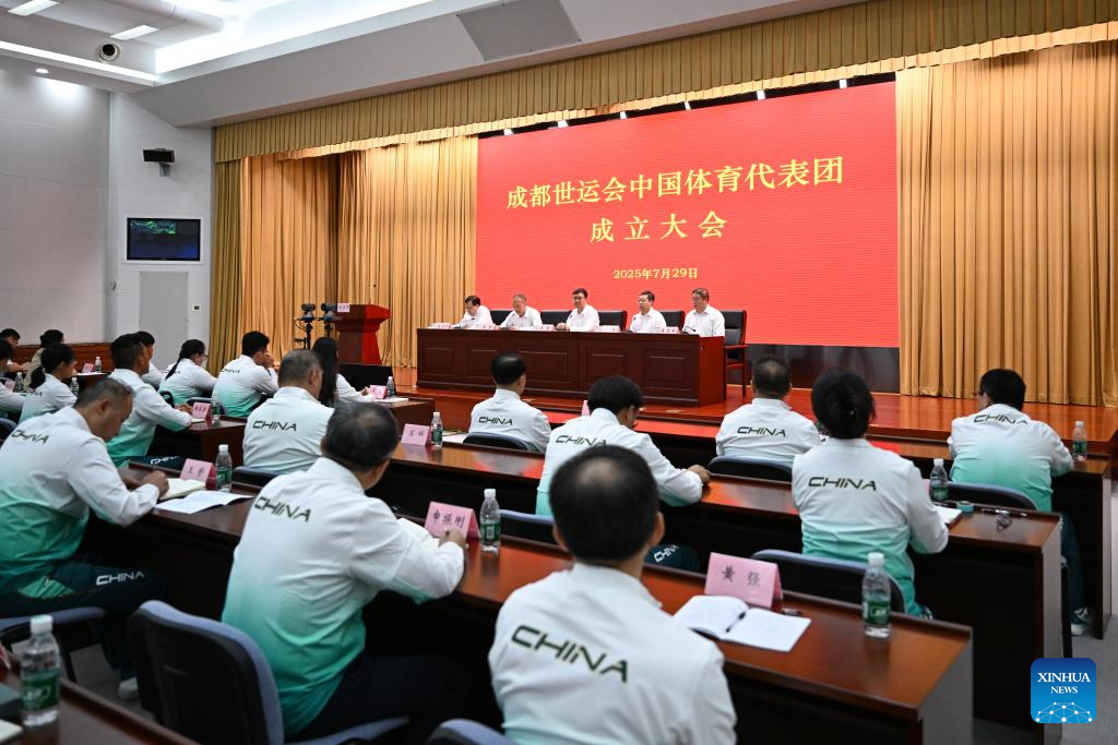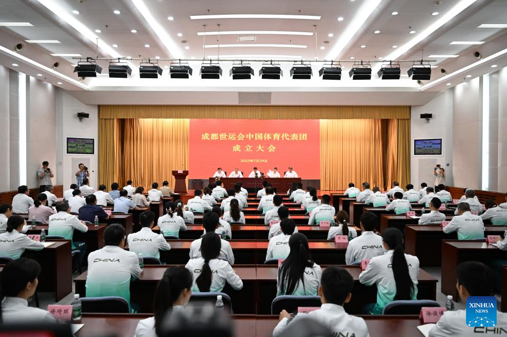 Participants attend the Chinese delegation's launch ceremony for the upcoming 2025 Chengdu World Games in Beijing, capital of China, July 29, 2025. China unveiled a 489-member delegation, including 321 athletes. The team will compete in 152 events across 28 sports, marking China's largest participation in the history of the Games. (Xinhua/Song Yanhua)