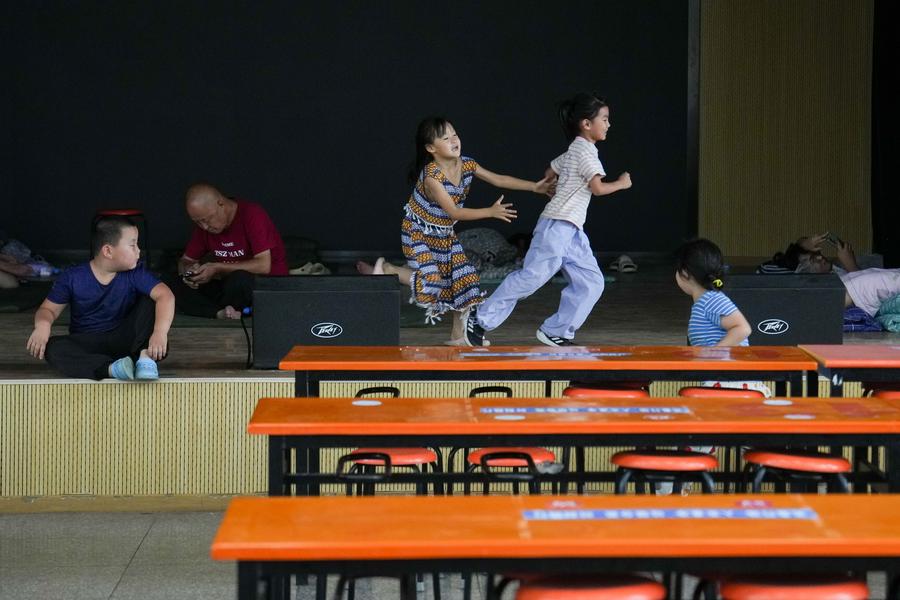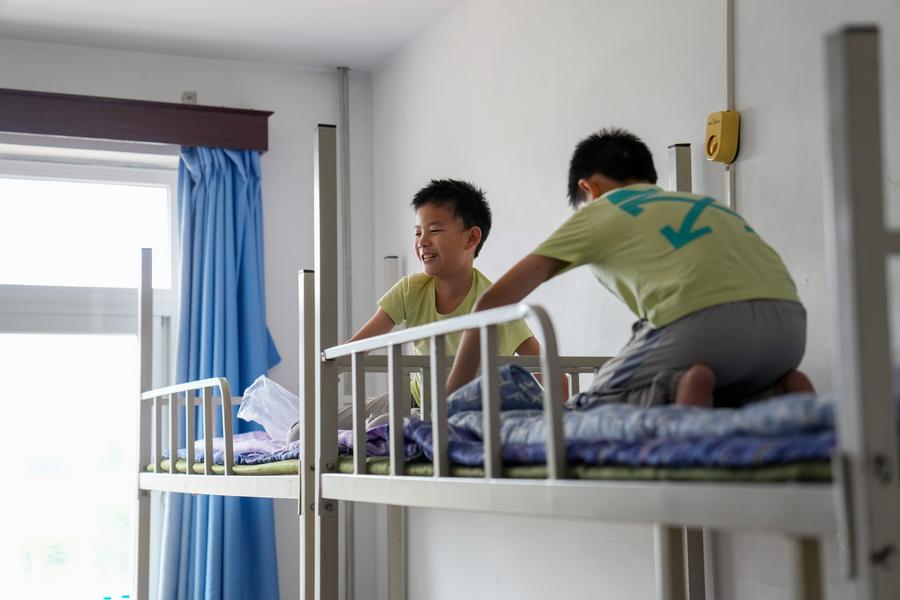 Two kids play at a resettlement site in a local middle school in Miyun District, Beijing, capital of China, July 29, 2025. (Xinhua/Ju Huanzong)