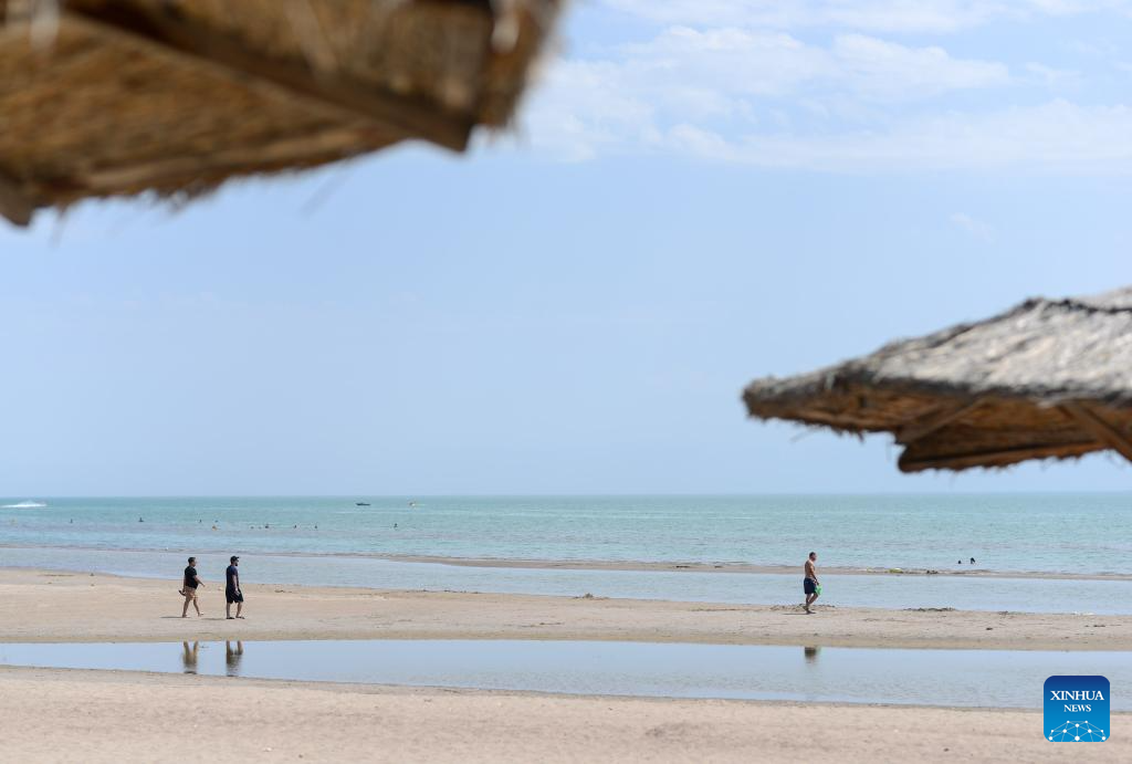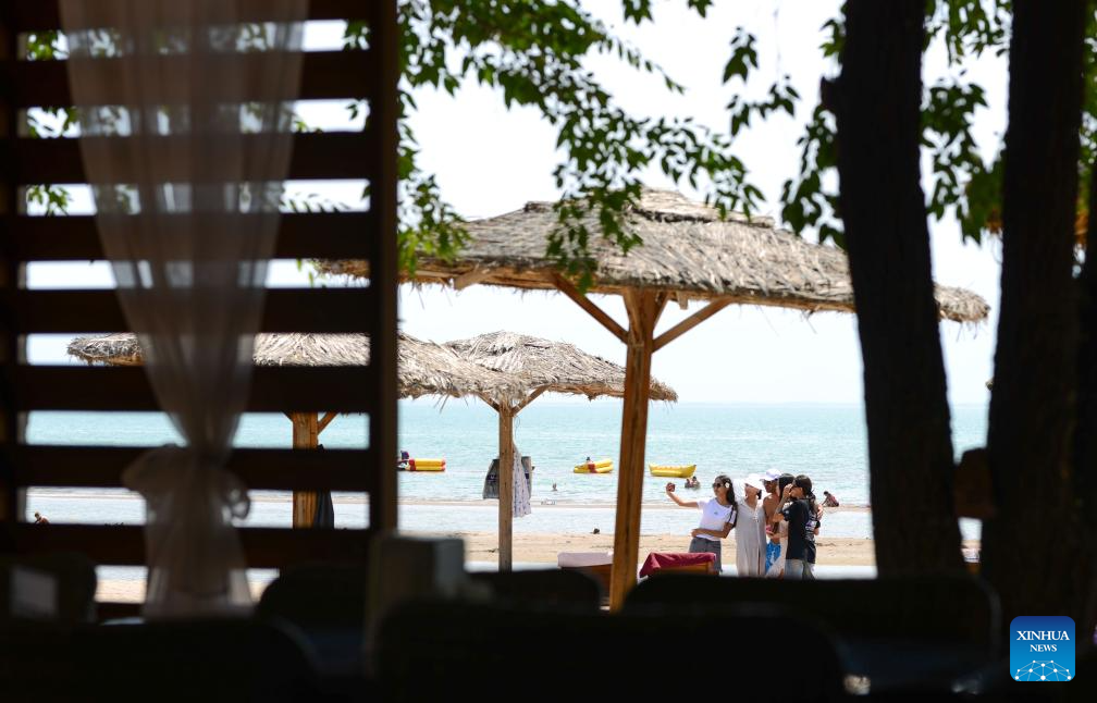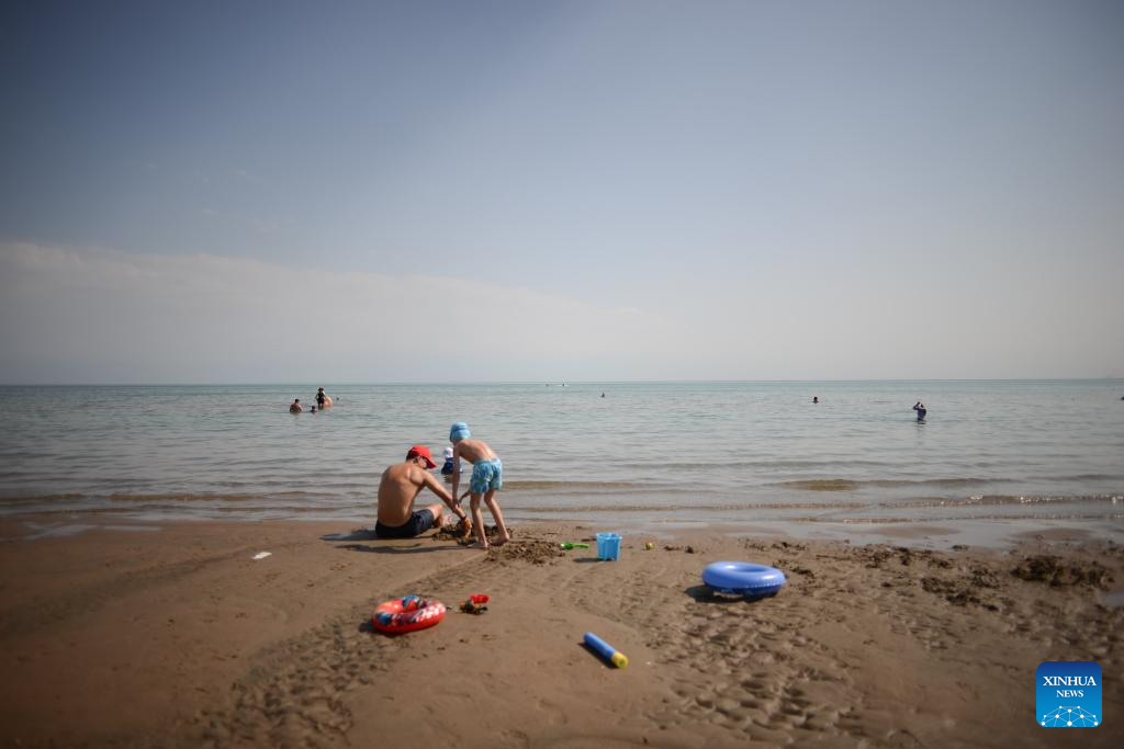 People visit the Kapchagay Reservoir in Konaev, Almaty region, Kazakhstan on July 26, 2025. Recently, the southern part of Kazakhstan, including the city of Almaty, Almaty region and South Kazakhstan region, has been hit by high heat waves. (Xinhua/Li Renzi)
