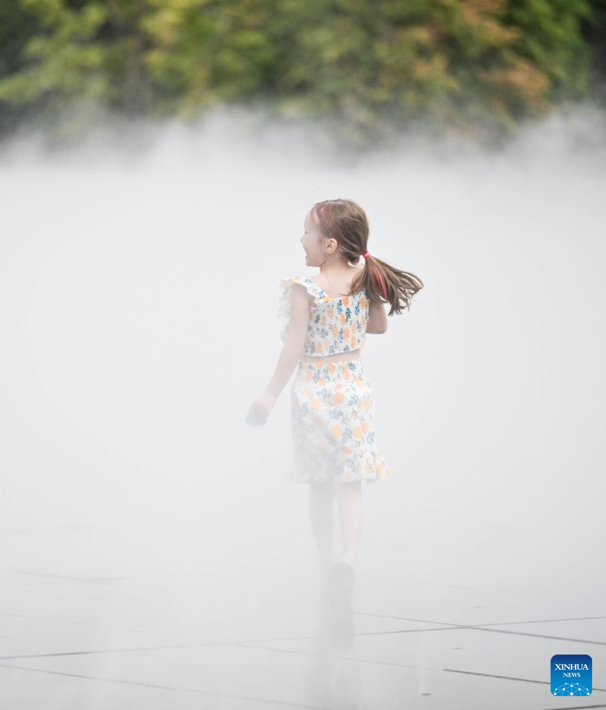 A child plays at a plaza equipped with mist cooling devices in Almaty, Kazakhstan on July 27, 2025. Recently, the southern part of Kazakhstan, including the city of Almaty, Almaty region and South Kazakhstan region, has been hit by high heat waves. (Xinhua/Li Renzi)