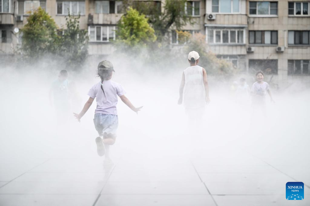 Children play at a plaza equipped with mist cooling devices in Almaty, Kazakhstan on July 27, 2025. Recently, the southern part of Kazakhstan, including the city of Almaty, Almaty region and South Kazakhstan region, has been hit by high heat waves. (Xinhua/Li Renzi)