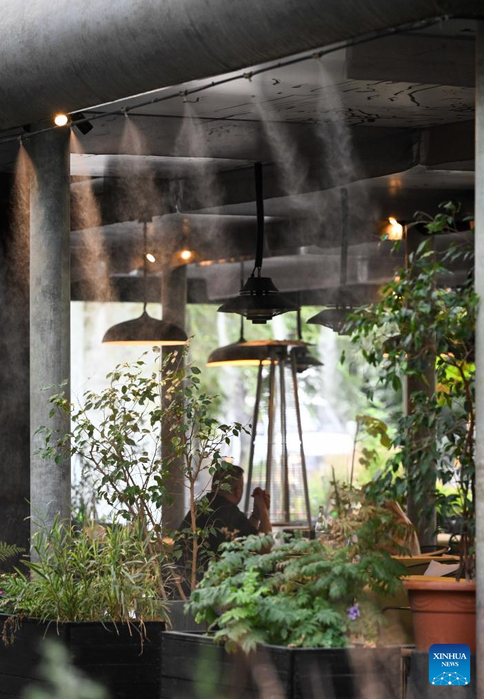 This photo taken on July 27, 2025 shows the mist cooling devices at a restaurant in Almaty, Kazakhstan. Recently, the southern part of Kazakhstan, including the city of Almaty, Almaty region and South Kazakhstan region, has been hit by high heat waves. (Xinhua/Li Renzi)