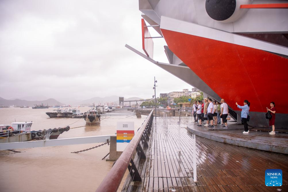 Tourists take shelter from rainfall in Xiangshan County of Ningbo, east China's Zhejiang Province, July 29, 2025. Typhoon Co-May, the eighth typhoon of this year, brought heavy rainfall to Xiangshan County of Ningbo. Local vessels have returned to harbor to take shelter and ferry services have been suspended. (Xinhua/Jiang Han)