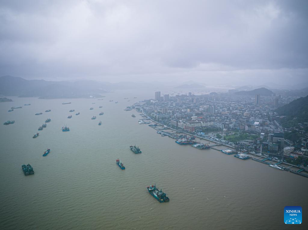 An aerial drone photo taken on July 29, 2025 shows vessels heading towards Shipu Port to take shelter in Xiangshan County of Ningbo, east China's Zhejiang Province. Typhoon Co-May, the eighth typhoon of this year, brought heavy rainfall to Xiangshan County of Ningbo. Local vessels have returned to harbor to take shelter and ferry services have been suspended. (Xinhua/Jiang Han)