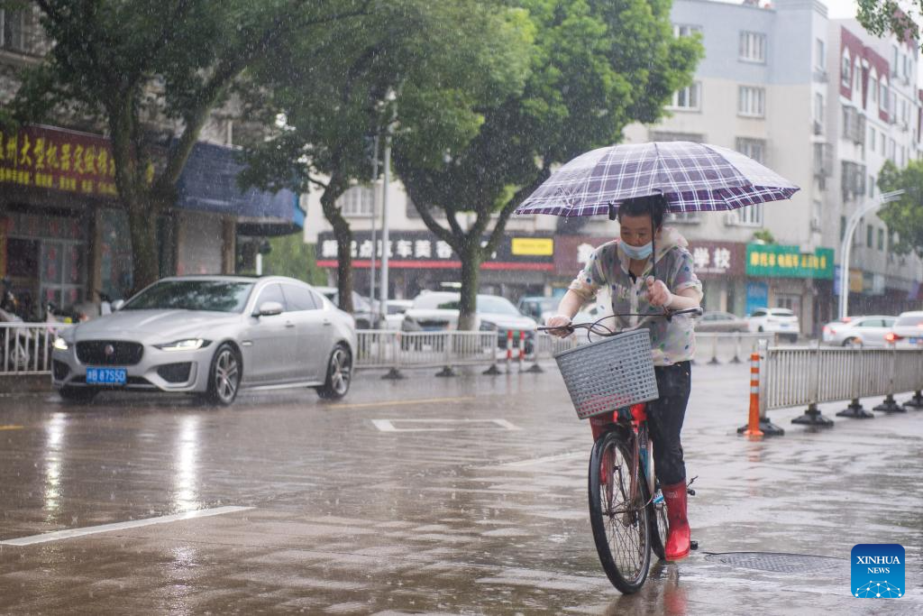 A woman rides a bicycle amid heavy rainfall in Xiangshan County of Ningbo, east China's Zhejiang Province, July 29, 2025. Typhoon Co-May, the eighth typhoon of this year, brought heavy rainfall to Xiangshan County of Ningbo. Local vessels have returned to harbor to take shelter and ferry services have been suspended. (Xinhua/Jiang Han)