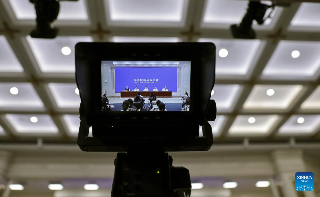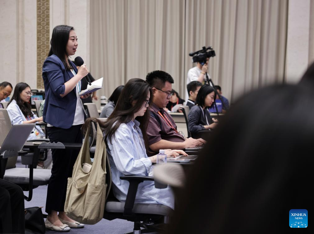 A journalist asks questions at a press conference held by the State Council Information Office (SCIO) on China's immigration management achievements during the 14th Five-Year Plan period (2021-2025) in Beijing, capital of China, July 30, 2025. Wang Zhizhong, vice minister of public security and head of the National Immigration Administration (NIA), and NIA officials Xiong Shuren, Chi Jingyang and Liu Jia, attended the press conference in Beijing on Wednesday. (Xinhua/Zhang Yuwei)