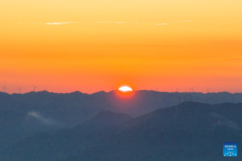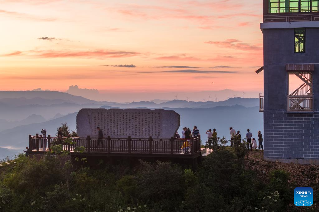 A drone photo taken on July 30, 2025 shows tourists enjoying sunrise scenery at Xuefeng Mountain national forest park in Huaihua City, central China's Hunan Province. (Xinhua/Chen Sihan)