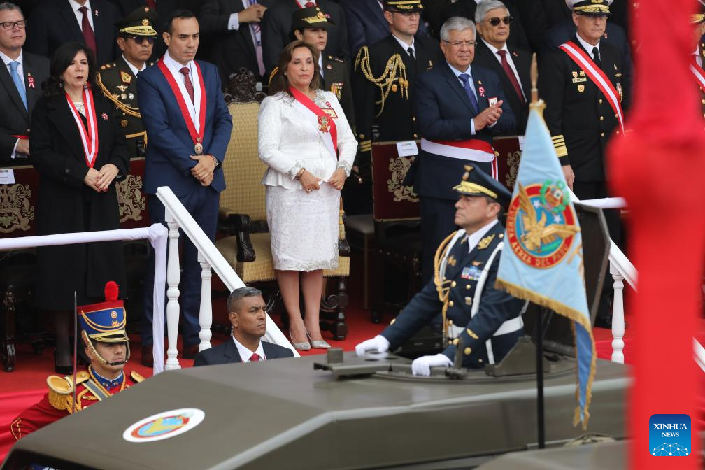 Peru's President Dina Boluarte (C) attends a parade to commemorate the 204th anniversary of Peru's independence in Lima, Peru, on July 29, 2025. (Photo by Mariana Bazo/Xinhua)
