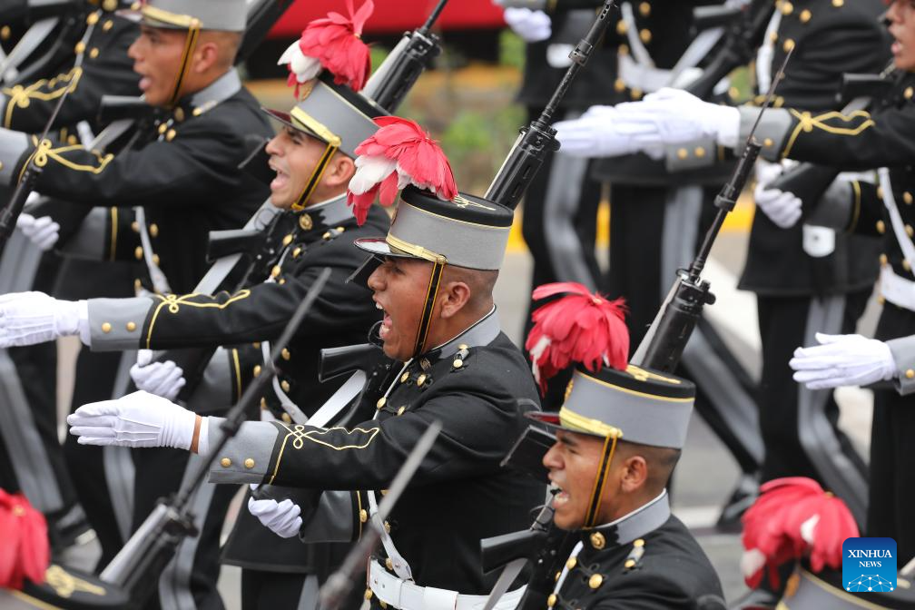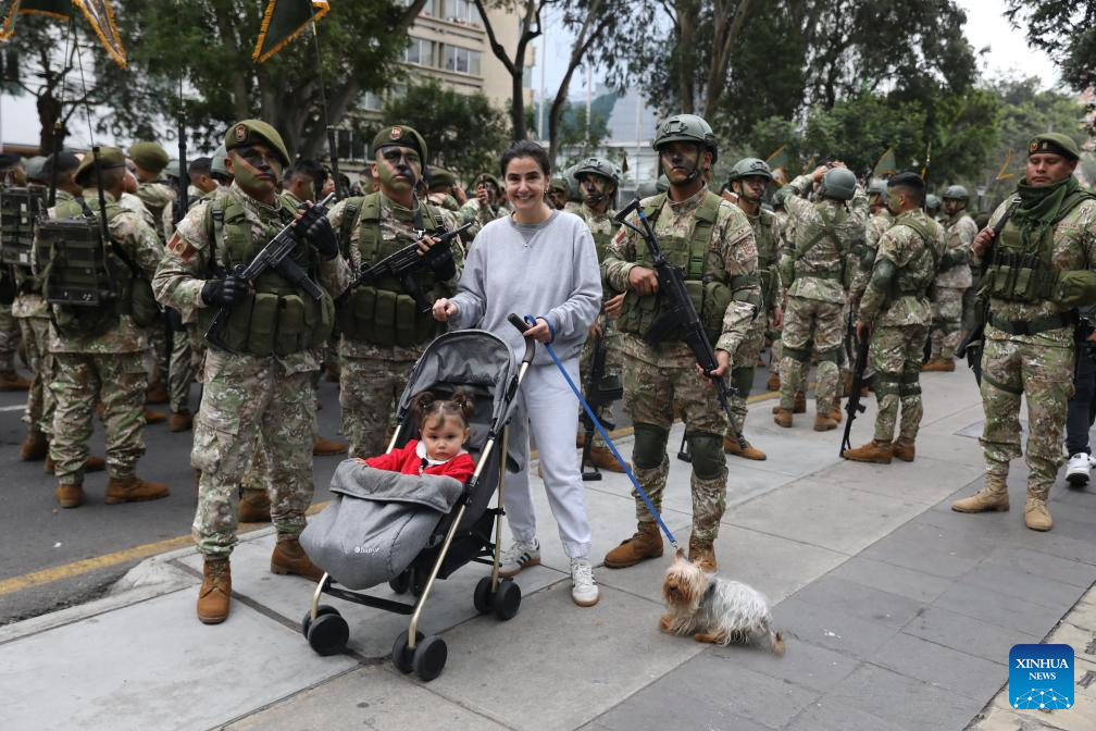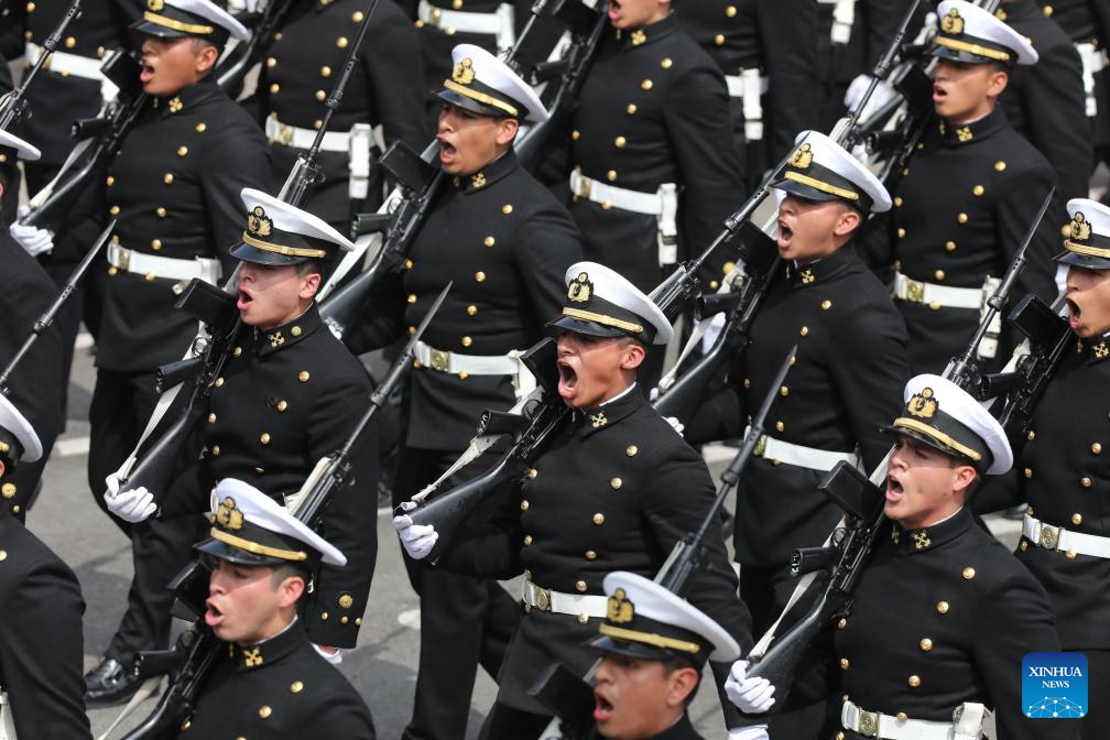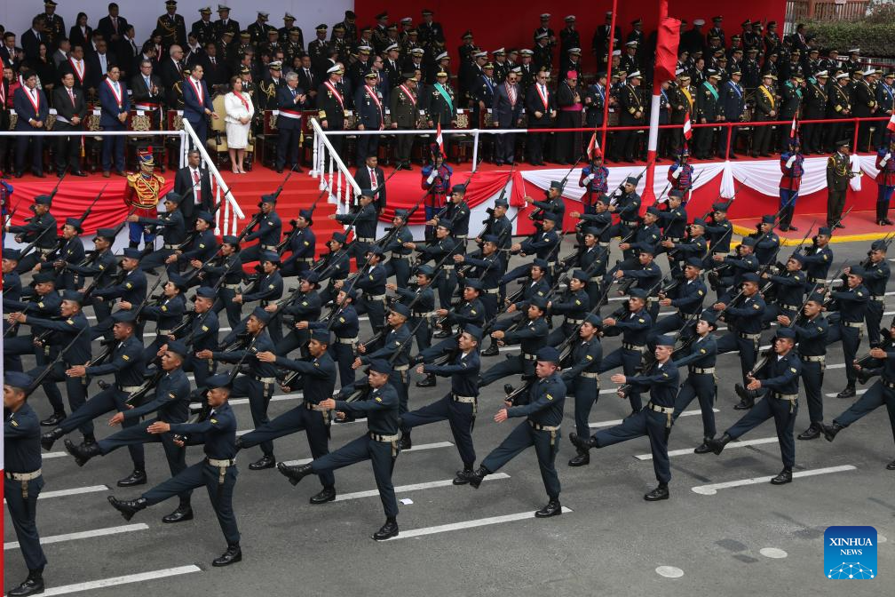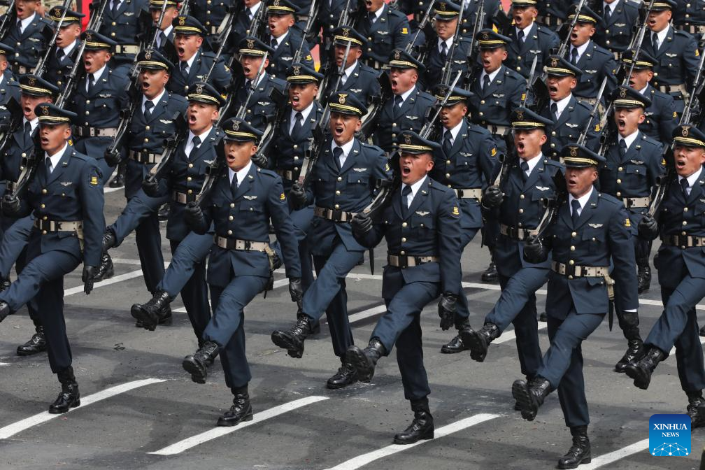 Soldiers participate in a parade to commemorate the 204th anniversary of Peru's independence in Lima, Peru, on July 29, 2025. (Photo by Mariana Bazo/Xinhua)