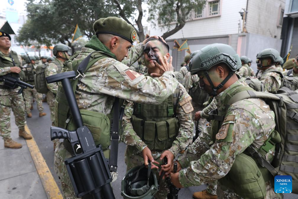 Soldiers prepare before a parade to commemorate the 204th anniversary of Peru's independence in Lima, Peru, on July 29, 2025. (Photo by Mariana Bazo/Xinhua)