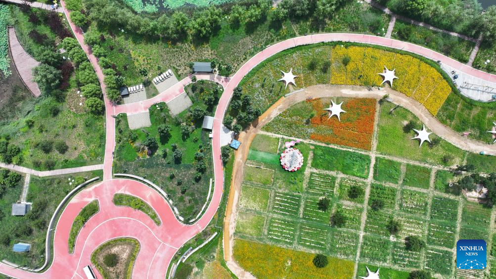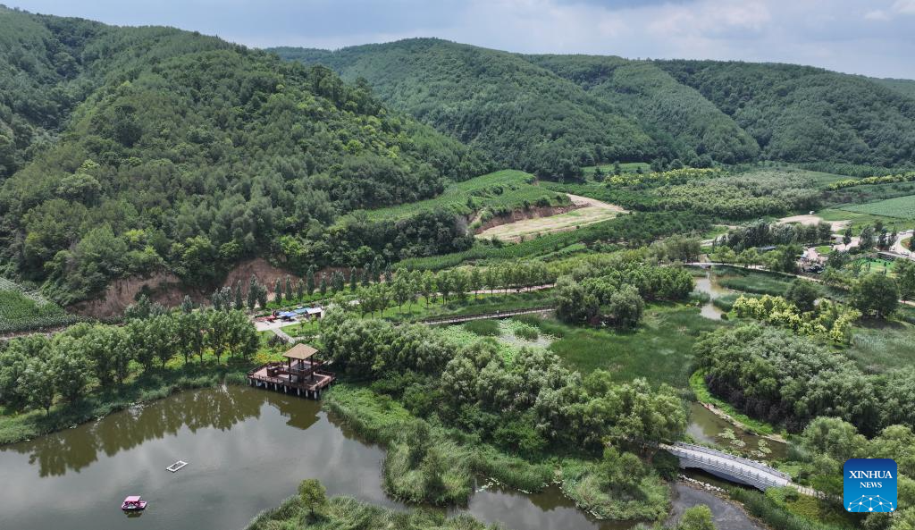 An aerial drone photo taken on July 29, 2025 shows a view of the Nanniwan National Wetland Park in Yan'an City, northwest China's Shaanxi Province. (Xinhua/Fan Yuqing)