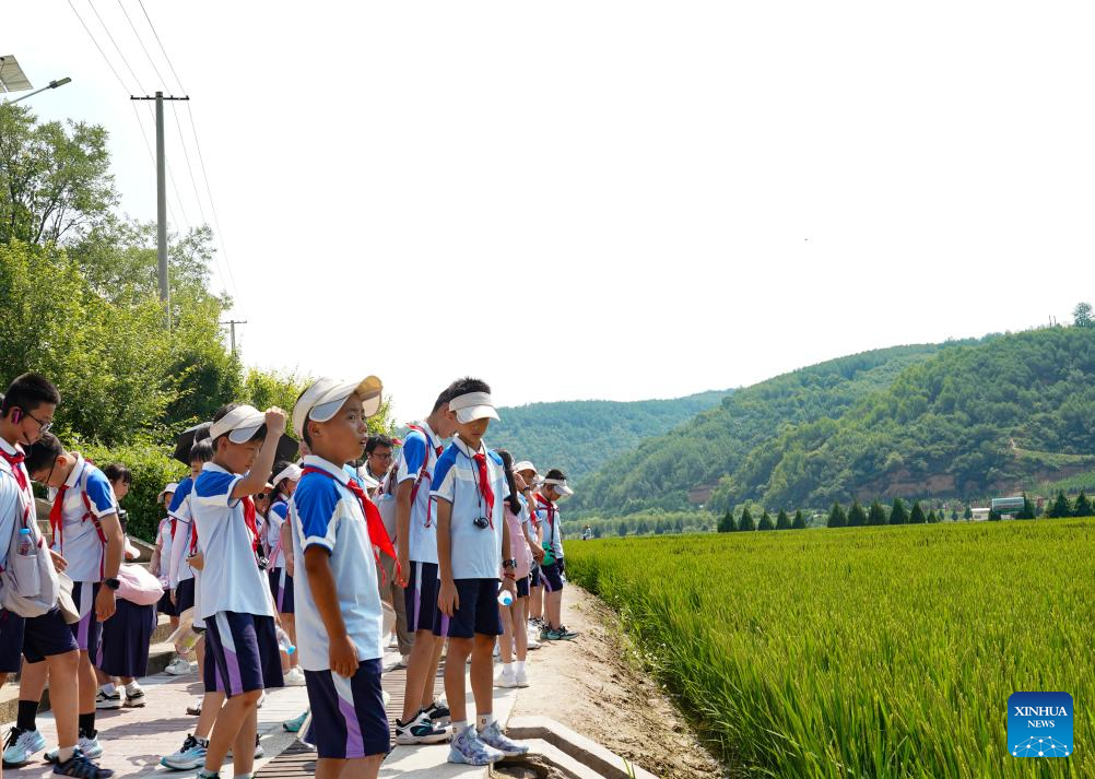 A group of primary school students visit paddy fields during a study trip in Nanniwan Township of Yan'an City, northwest China's Shaanxi Province, July 29, 2025. (Xinhua/Fan Yuqing)