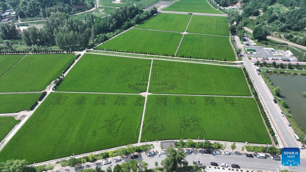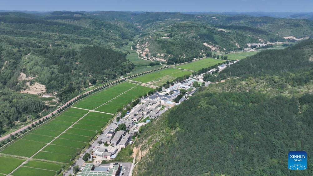 An aerial drone photo taken on July 29, 2025 shows a view of paddy fields in Nanniwan Township of Yan'an City, northwest China's Shaanxi Province. (Xinhua/Fan Yuqing)