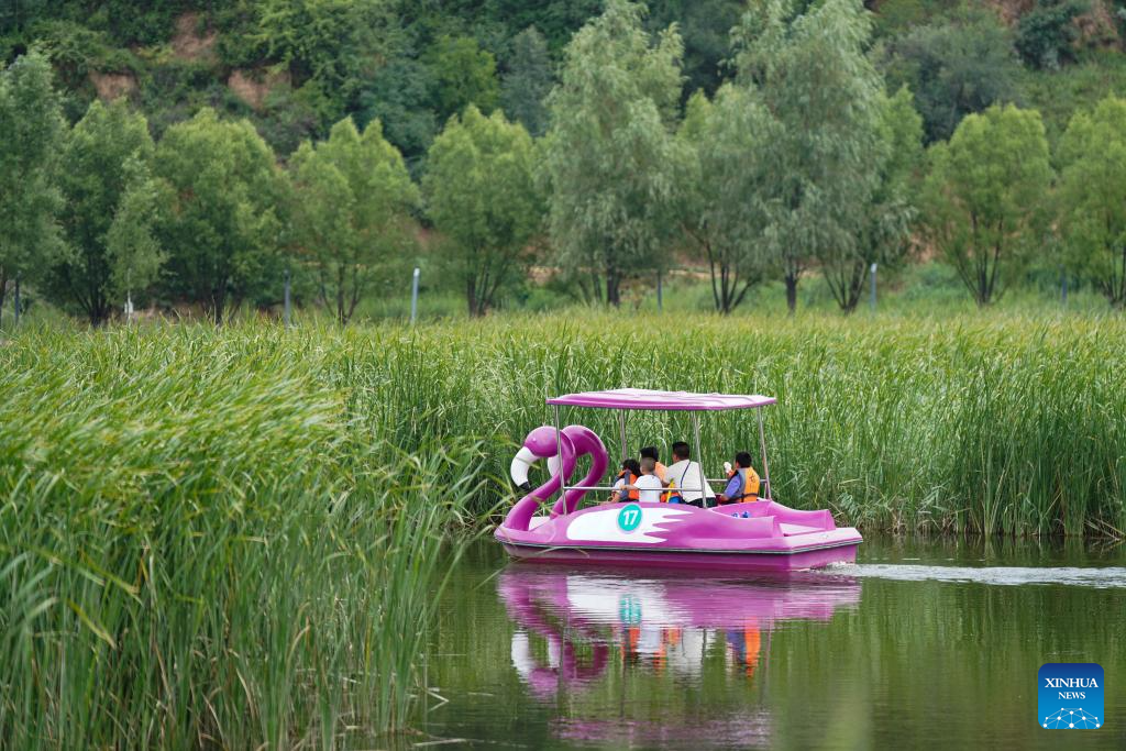 Tourists enjoy themselves at the Nanniwan National Wetland Park in Yan'an City, northwest China's Shaanxi Province, July 29, 2025. (Xinhua/Fan Yuqing)