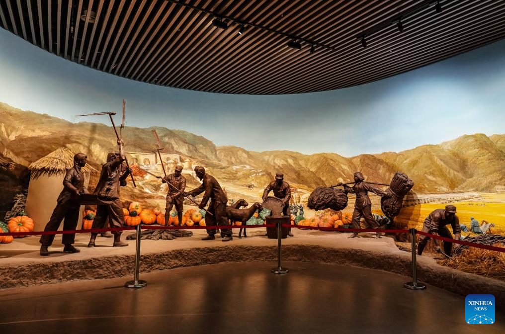 This photo taken on July 29, 2025 shows sculptures inside the memorial hall for a large-scale production campaign in Nanniwan Township of Yan'an City, northwest China's Shaanxi Province. (Xinhua/Fan Yuqing)