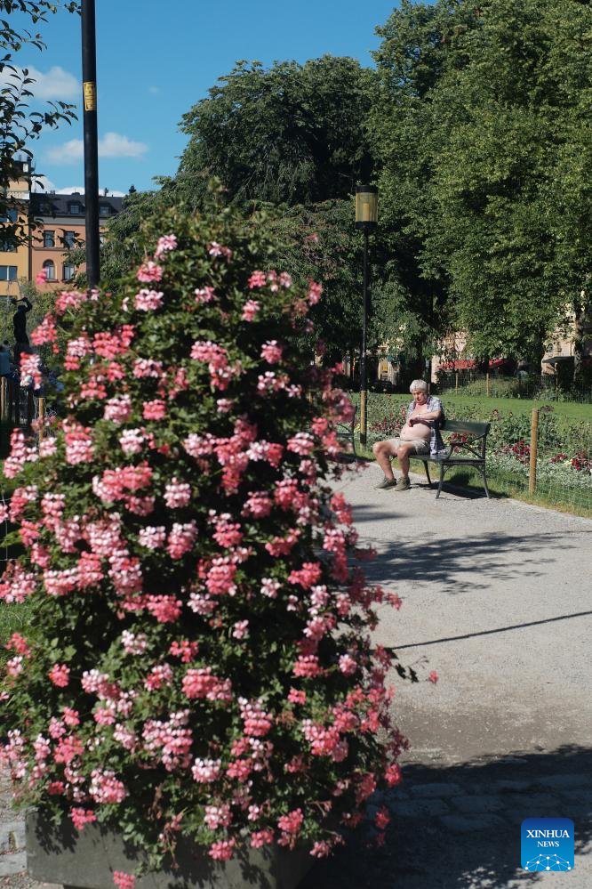 A woman basks in the sun in Stockholm, Sweden on July 27, 2025. (Xinhua/Peng Ziyang)