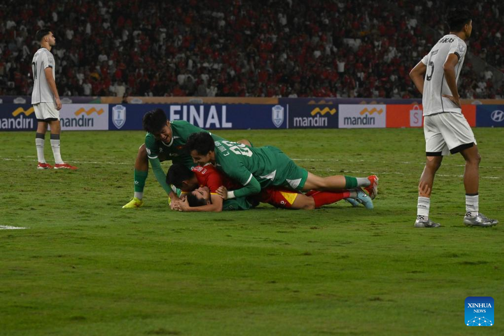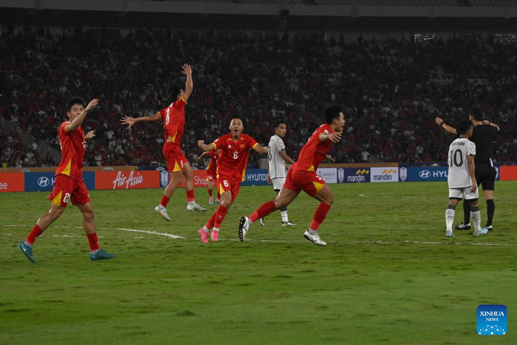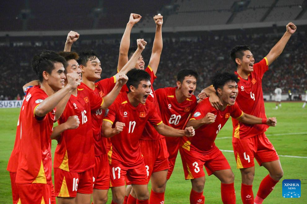 Players of Vietnam celebrate after scoring during the ASEAN Football Federation (AFF) U23 Championship 2025 final match between Vietnam and Indonesia in Jakarta, Indonesia, July 29, 2025. (Xinhua/Agung Kuncahya B.)