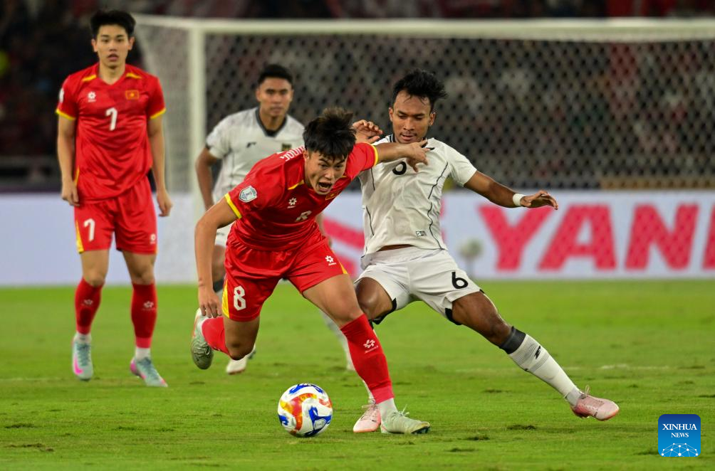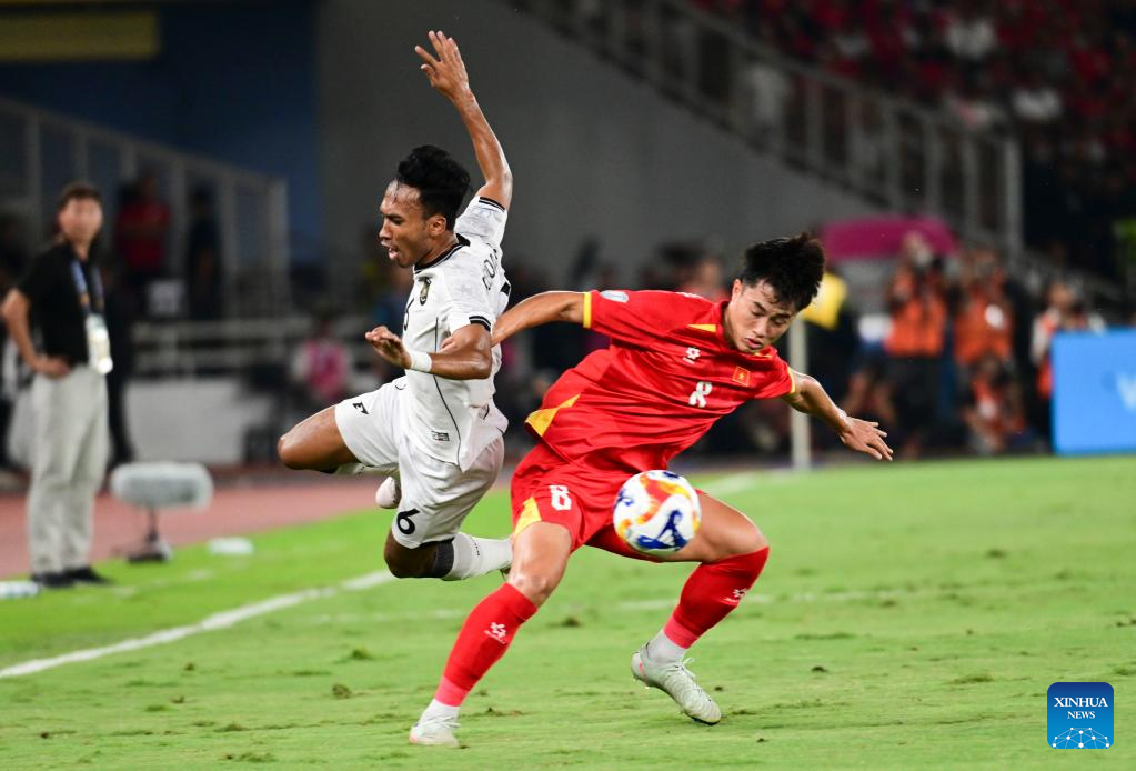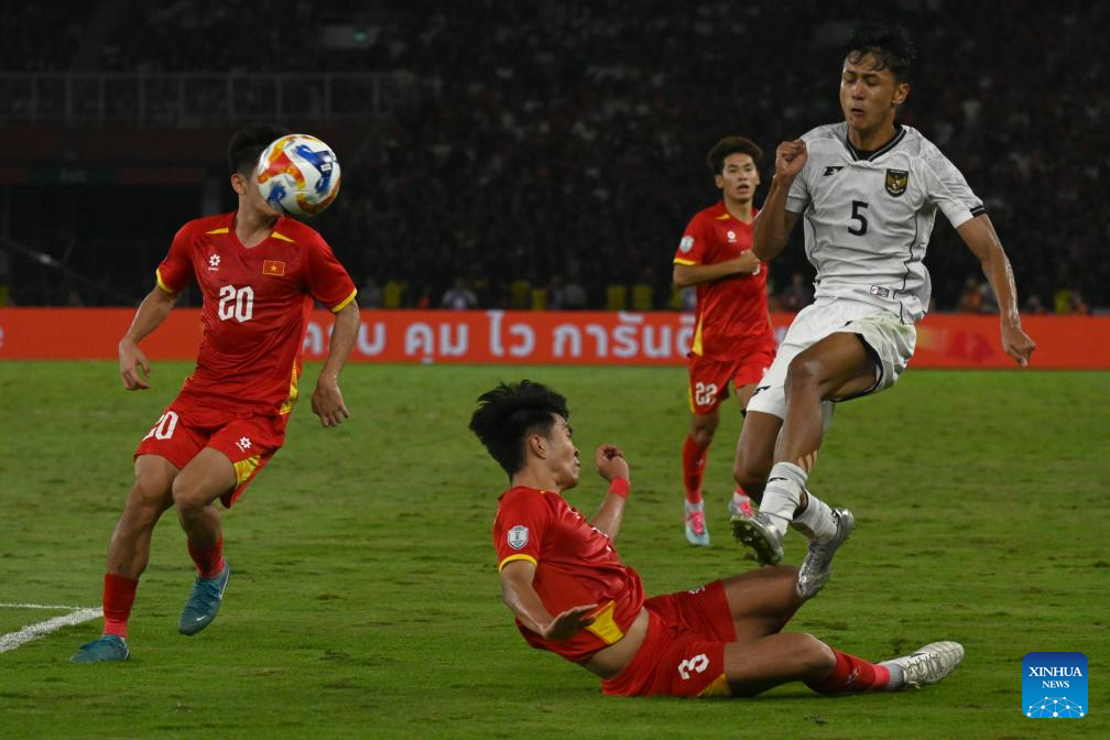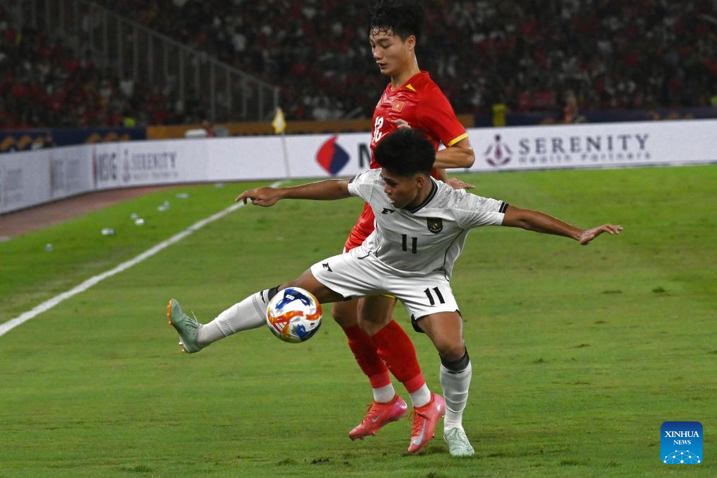 Dinh Bac Nguyen (L) of Vietnam vies with Muhammad Ferrari of Indonesia during the ASEAN Football Federation (AFF) U23 Championship 2025 final match between Vietnam and Indonesia in Jakarta, Indonesia, July 29, 2025. (Xinhua/Agung Kuncahya B.)