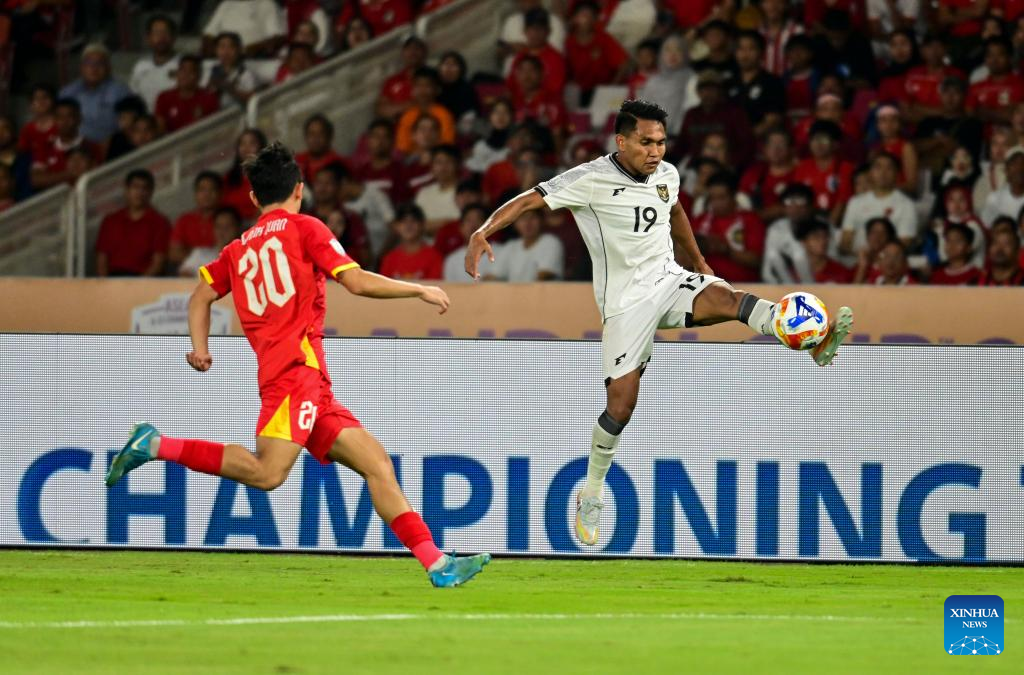 Rahmat Arjuna Reski (front) of Indonesia controls the ball during the ASEAN Football Federation (AFF) U23 Championship 2025 final match between Vietnam and Indonesia in Jakarta, Indonesia, July 29, 2025. (Xinhua/Agung Kuncahya B.)