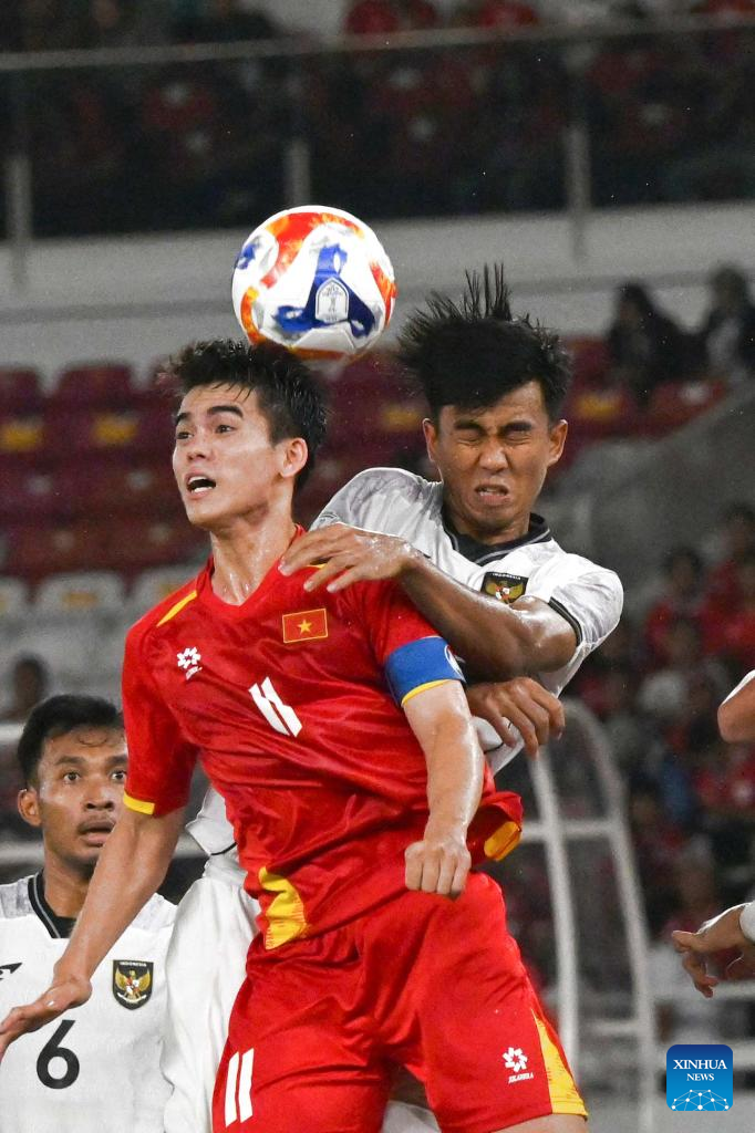 Van Khang Khuat (2nd L) of Vietnam heads the ball during the ASEAN Football Federation (AFF) U23 Championship 2025 final match between Vietnam and Indonesia in Jakarta, Indonesia, July 29, 2025. (Xinhua/Agung Kuncahya B.)