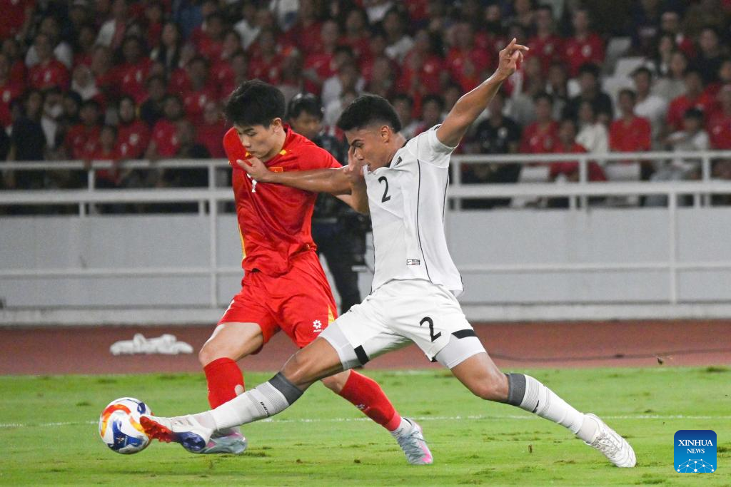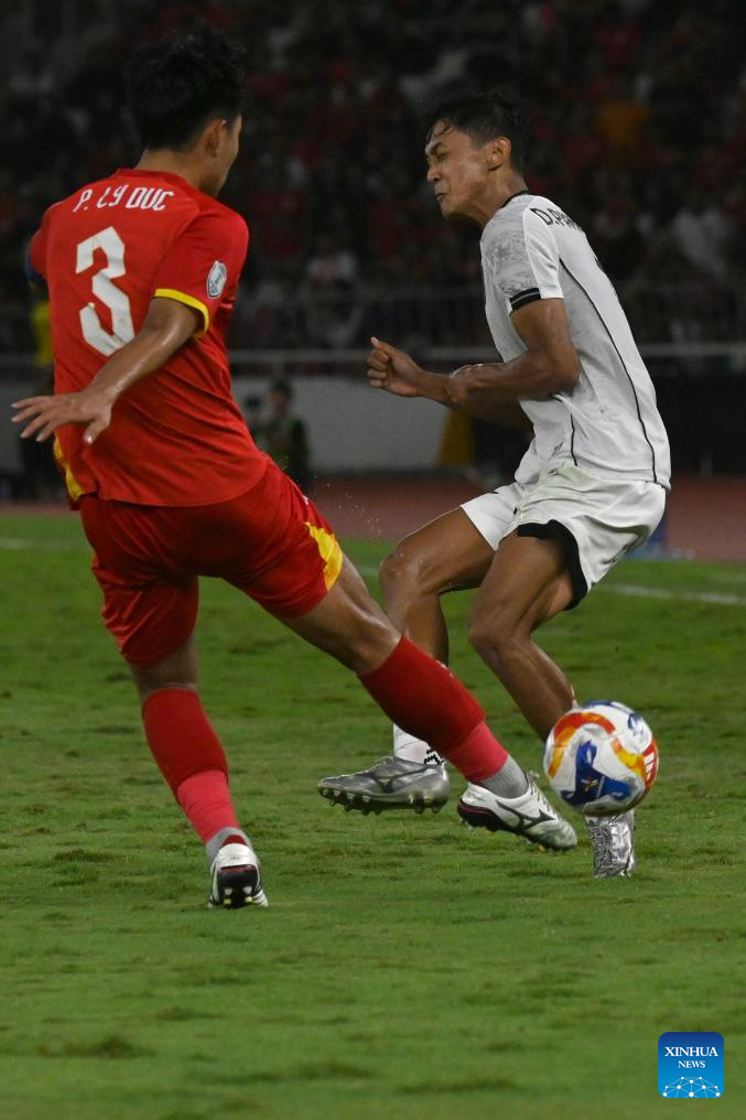 Frengky Deaner Missa (R) of Indonesia competes during the ASEAN Football Federation (AFF) U23 Championship 2025 final match between Vietnam and Indonesia in Jakarta, Indonesia, July 29, 2025. (Xinhua/Zulkarnain)