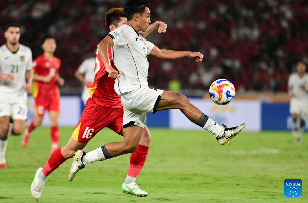 Kadek Arel Priyatna (L) of Indonesia competes during the ASEAN Football Federation (AFF) U23 Championship 2025 final between Indonesia and Vietnam in Jakarta, Indonesia, July 29, 2025. (Xinhua/Agung Kuncahya B.)