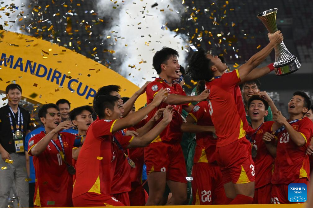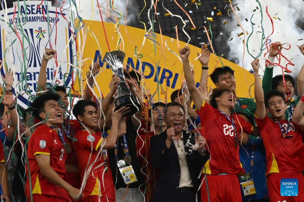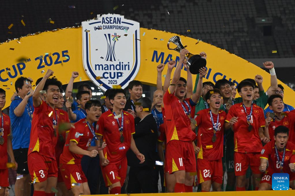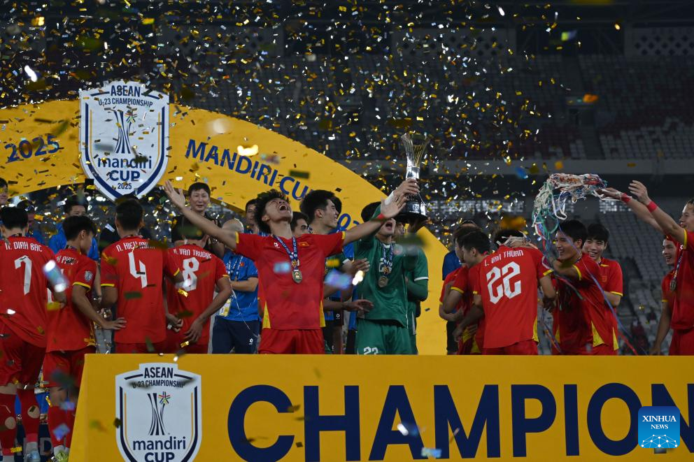 Players of Vietnam celebrate winning the ASEAN Football Federation (AFF) U23 Championship 2025 final between Indonesia and Vietnam in Jakarta, Indonesia, July 29, 2025. (Xinhua/Agung Kuncahya B.)