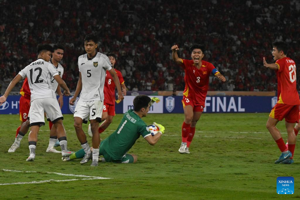 Trung Kien Tran (bottom), goalkeeper of Vietnam, competes during the ASEAN Football Federation (AFF) U23 Championship 2025 final between Indonesia and Vietnam in Jakarta, Indonesia, July 29, 2025. (Xinhua/Agung Kuncahya B.)