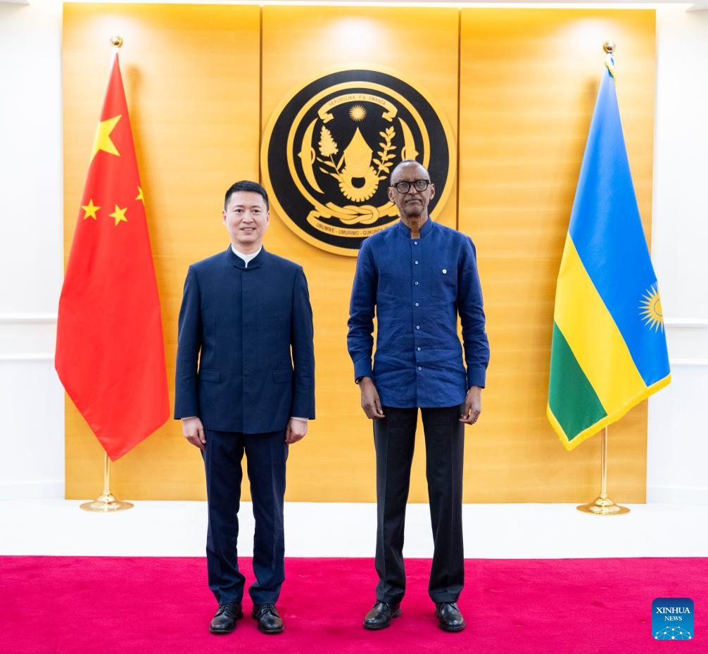 Rwandan President Paul Kagame (R) and Chinese Ambassador to Rwanda Gao Wenqi pose for a photo in Kigali, Rwanda, on July 29, 2025. Kagame said on Tuesday that China is a good friend, and he looks forward to strengthening the traditional friendship and practical cooperation between the two countries. He made the remarks while receiving the letter of credence of Gao Wenqi, the new Chinese ambassador to Rwanda. (Rwandan Office of the President/Handout via Xinhua)