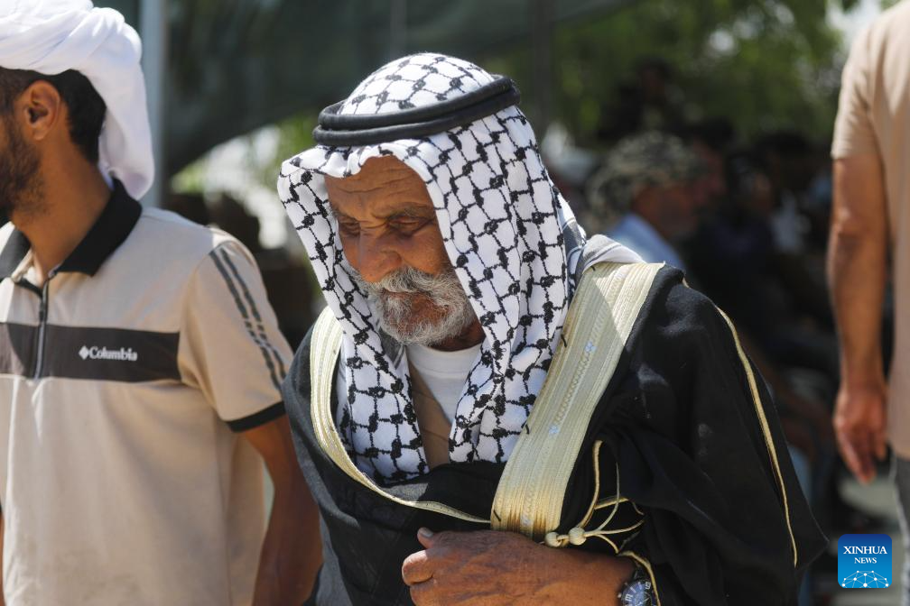 Palestinians mourn the death of Odeh Mohammad Khalil al-Hathalin in Umm al-Khair village of Hebron, southern West Bank, on July 29, 2025. The young Palestinian man was shot on Monday evening by the Israeli forces in the village of Umm al-Khair, east of Yatta, the Palestinian official news agency WAFA reported. (Photo by Mamoun Wazwaz/Xinhua)