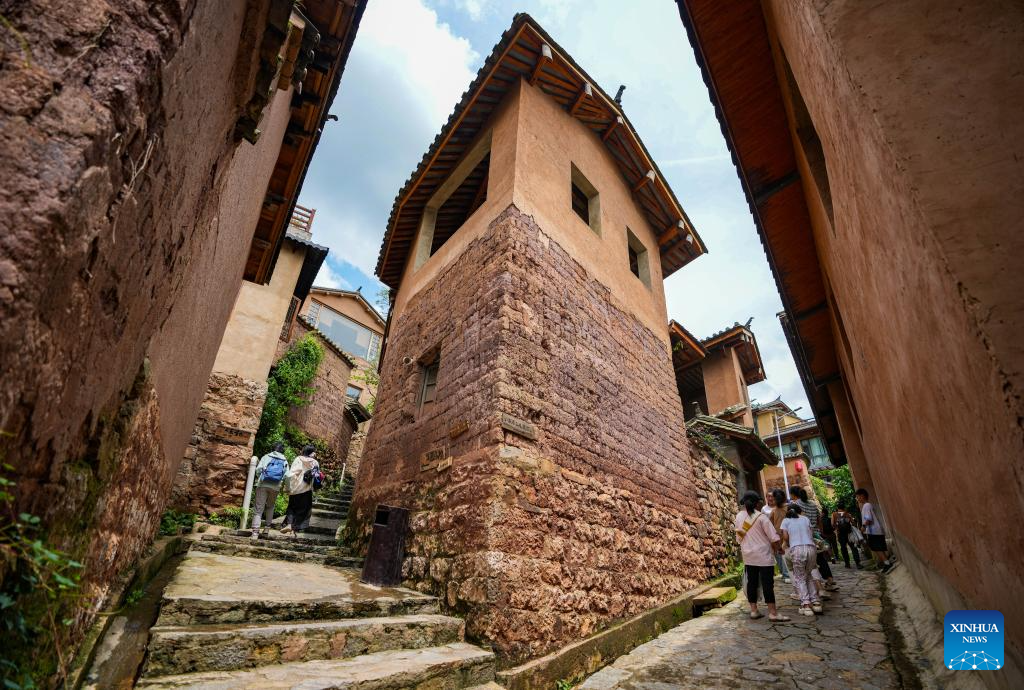 Tourists are pictured in Leju Village in Xishan District of Kunming City, southwest China's Yunnan Province, July 27, 2025. Leju Village in Kunming is an ancient Yi ethnic village with a history of over 600 years. Its name, derived from the Yi language, means "the village at the foot of the rocky mountain," and it is renowned for its unique residential architecture.(Xinhua/Chen Xinbo)