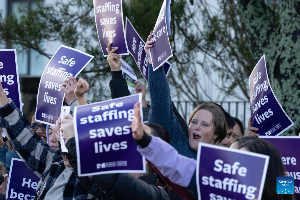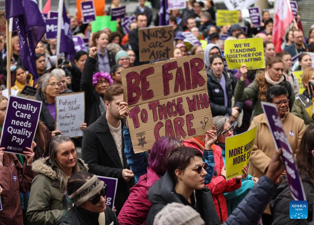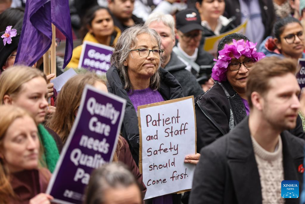 People take part in a strike in Auckland, New Zealand, on July 30, 2025. More than 36,000 nurses, midwives and health care assistants across New Zealand started a strike for 24 hours from Wednesday morning after negotiations on salary and staff recruitment failed with the authority. (Photo by Wu Jiaxiang/Xinhua)
