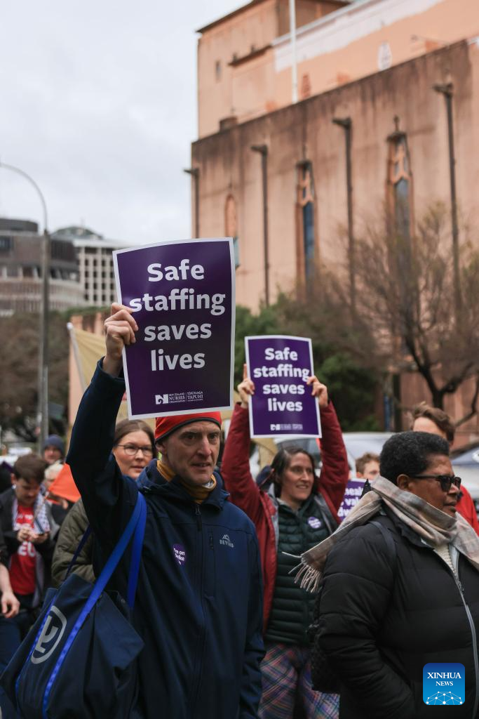 People take part in a strike in Wellington, New Zealand, on July 30, 2025. More than 36,000 nurses, midwives and health care assistants across New Zealand started a strike for 24 hours from Wednesday morning after negotiations on salary and staff recruitment failed with the authority. (Xinhua/Long Lei)