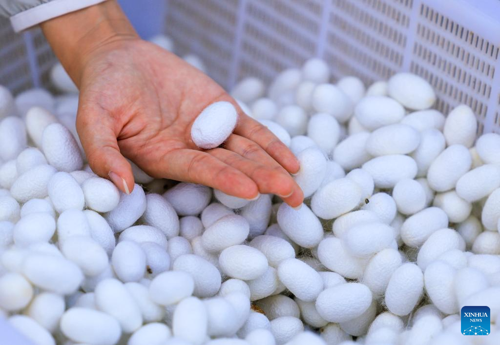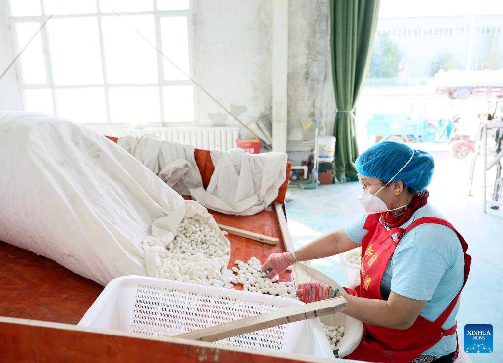 A worker sorts silkworm cocoons at the production workshop of a silk textile company in Wusu City, northwest China's Xinjiang Uygur Autonomous Region, July 29, 2025. In recent years, Wusu City has introduced an intelligent full-industry-chain project for mulberry silk production, by scaling up silkworm breeding and mulberry growing. This initiative aims to optimize the local agricultural structure, boost farmers' income, and drive rural revitalization. (Xinhua/Wang Fei)